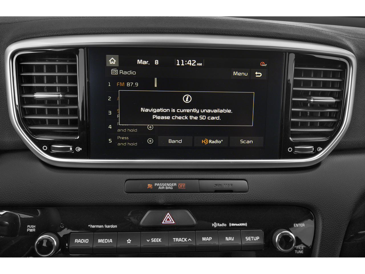 - Radio: AM/FM/MP3 Premium Audio System -inc: 320 Watts, 8" touchscreen, UVO link, navigation, harman/kardon sound system, 8 speakers including subwoofer and tweeters, Clari-Fi digital audio restoration, SiriusXM satellite radio, additional USB port, Bluetooth® wireless technology, voice control, Android Auto and Apple CarPlay