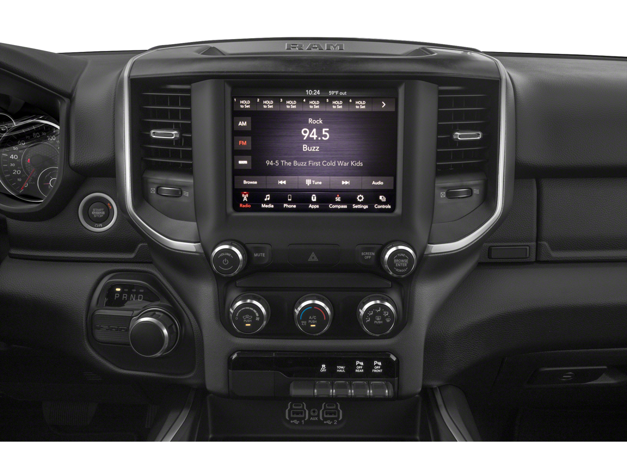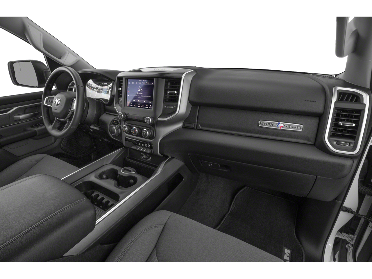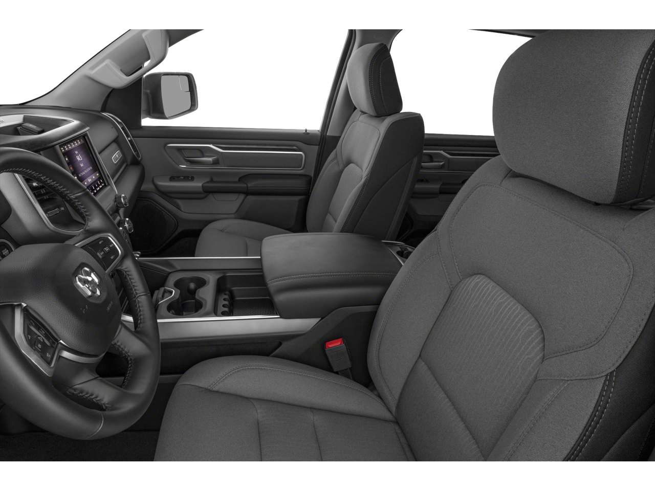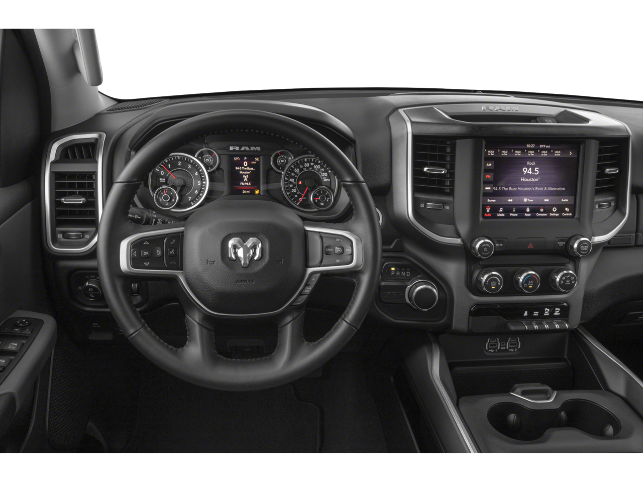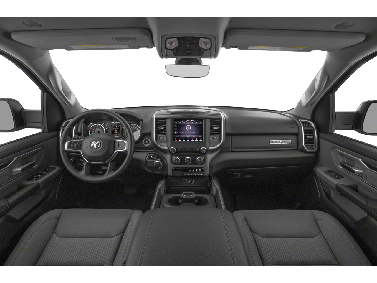 115V Auxiliary Power Outlet, 115V Auxiliary Rear Power Outlet, 2 USB Full Function/Charge Only Media Hub, 2nd Row In Floor Storage Bins, 3 Rear Seat Head Restraints, 4 Way Front Headrests, 4-Wheel Disc Brakes, 400W Inverter, 48V Belt Starter Generator, 6 Speakers, ABS brakes, Air Conditioning, Air Conditioning ATC w/Dual Zone Control, Alloy wheels, AM/FM radio, Anti-Spin Differential Rear Axle, Auto-Dimming Exterior Driver Mirror, Auto-Dimming Rear-View Mirror, Big Horn Badge, Big Horn IP Badge, Big Horn Level 2 Equipment Group, Black Exterior Truck Badging, Black Headlamp Bezels, Black Interior Accents, Black Premium Power Mirrors, Body Color Door Handles, Body Color Exterior Mirrors, Body Color Front Bumper, Body Color Premium Power Mirrors, Body Color Rear Bumper w/Step Pads, Brake assist, Bucket Seats, Bumpers: chrome, Class IV Receiver Hitch, Cloth Bench Seat, Compass, Dampened Tailgate, Delay-off headlights, Deluxe Cloth Bucket Seats, Driver door bin, Dual Exhaust w/Black Tips, Dual front impact airbags, Dual front side impact airbags, Electronic Stability Control, Exterior Mirrors Courtesy Lamps, Exterior Mirrors w/Memory, Foam Bottle Insert (Door Trim Panel), Front anti-roll bar, Front Center Armrest w/Storage, Front fog lights, Front reading lights, Front Seat Back Map Pockets, Front wheel independent suspension, Full Length Floor Console, Fully automatic headlights, Glove Box Lamp, GPS Antenna Input, Grille Surround 1 Black Texture 2 Black, Heated door mirrors, Heated Front Seats, Heated Steering Wheel, Illuminated entry, Leather steering wheel, Low tire pressure warning, Manual Adjust 4-Way Front Passenger Seat, Night Edition, Occupant sensing airbag, Outside temperature display, Overhead airbag, Overhead console, Panic alarm, ParkSense Front/Rear Park Assist w/Stop, ParkView Rear Back-Up Camera, Passenger door bin, Passenger vanity mirror, Power 4-Way Driver Lumbar Adjust, Power 8-Way Driver Seat, Power Adjustable Pedals, Power door mirrors, Power steering, Power windows, Power-Folding Mirrors, Quick Order Package 25Z Big Horn, Radio data system, Radio: Uconnect 3 w/5 Display, Radio: Uconnect 4 w/8.4 Display, Rear 60/40 Folding Seat, Rear anti-roll bar, Rear Dome w/On/Off Switch Lamp, Rear Power Sliding Window, Rear seat center armrest, Rear step bumper, Rear Wheelhouse Liners, Rear Window Defroster, Remote keyless entry, Remote Start System, Security Alarm, SiriusXM Satellite Radio, Speed control, Split folding rear seat, Steering wheel mounted audio controls, Sun Visors w/Illuminated Vanity Mirrors, Tachometer, Telescoping steering wheel, Tilt steering wheel, Traction control, Trailer Brake Control, Trip computer, Universal Garage Door Opener, Variably intermittent wipers, Voltmeter, Wheels: 18 x 8 Cast-Aluminum Painted, Wheels: 20 x 9.0 Premium Paint/Polished.